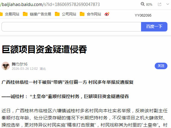 ——诚桂村: “土皇帝”秦某操控村务,巨额项目资金疑遭侵吞近日,广西桂林市临桂区六塘镇诚桂村多名村民向本社实名举报,反映该村副主任秦某在年龄、处分记录存疑的情况下长期把持村务,不仅借项目之机大肆敛财、操控选举,更对持异议村民实施“精准打击报复”,村民戏称其为村里的“土皇帝”。村民们历时数年多级举报,却遭遇了“信访轮回”,部分举报人甚至遭上门威胁、作物被毁、审批刁难。